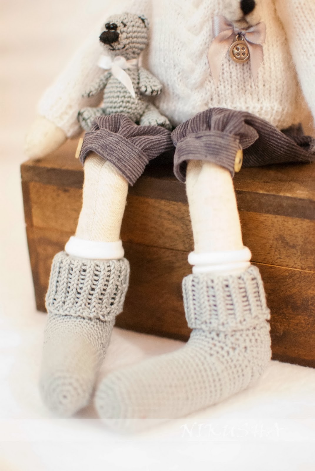Зайчишка предполагался быть девочкой, в белом сарафане , с ленточками бантиками, и в носочках серых. Так как я игрушки начинаю делать с обуви и ног , то вязались первые носки, они оказались слишком толстые и грубые и о сарафанчике уже речи быть и не могло, и тут сразу же сложился в голове новый образ....вот любуйтесь...